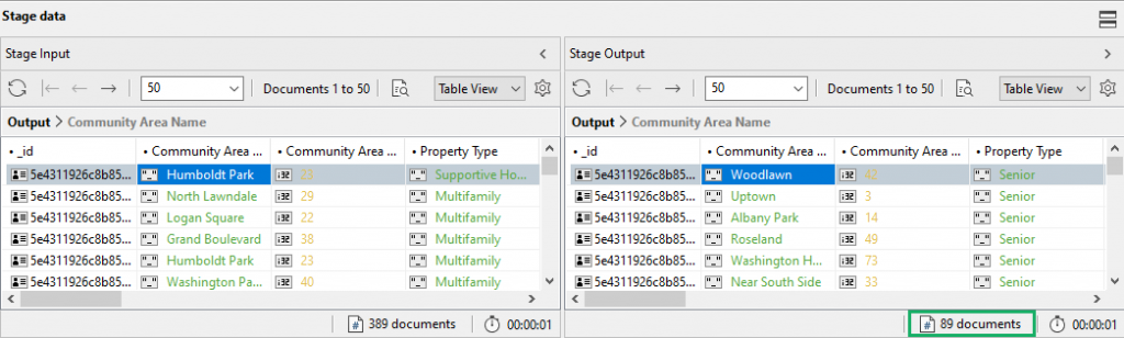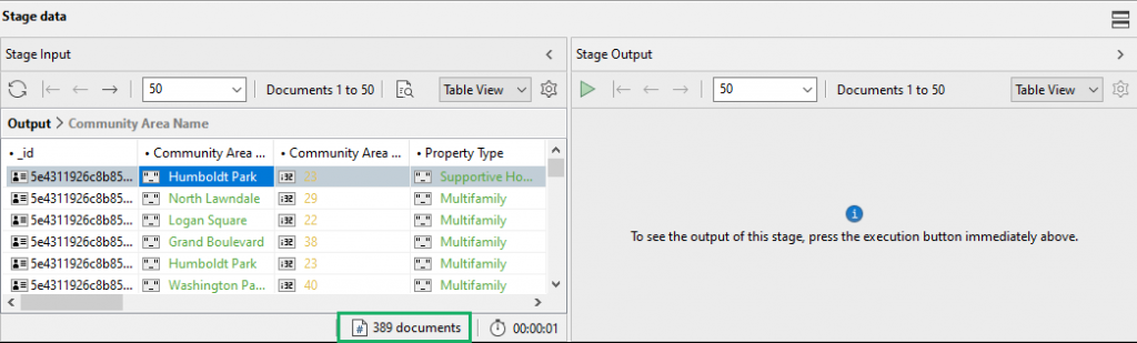 Now that we have the results we need from Stage 1 – a quick visual check of the column Property Type should do – we’re ready to pass them on to next stage of our aggregation pipeline, the $group stage.