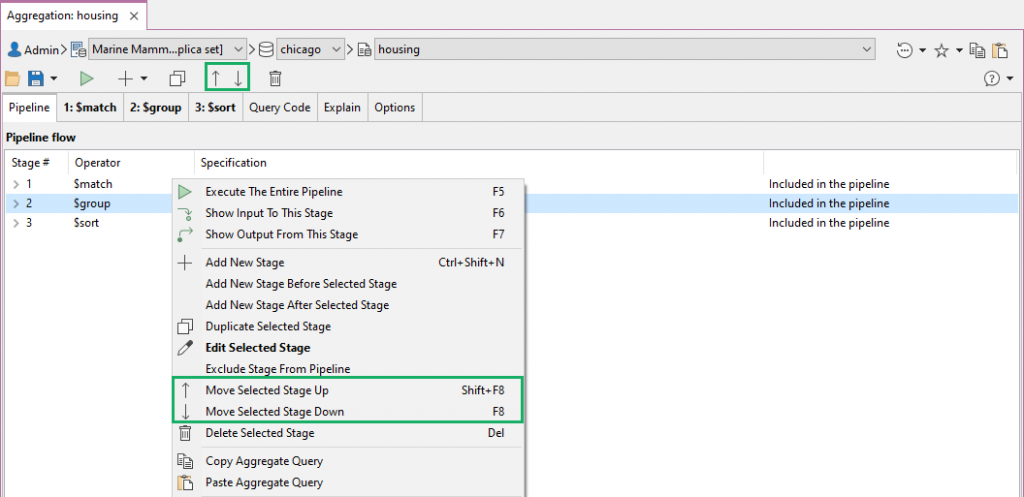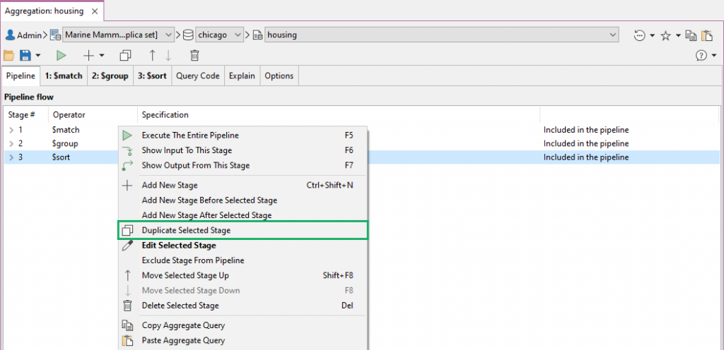 - Pipeline section and Stage editor – Right-click and choose Copy Aggregate Query or Paste Aggregate Query