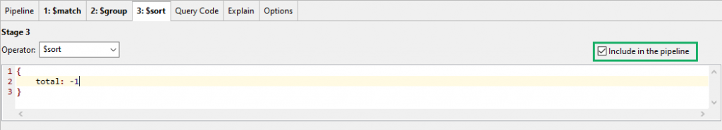 To do this, we’ll add a third stage, choose the $sort operator from the dropdown, and write the following specification: