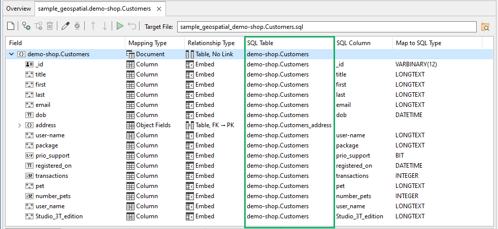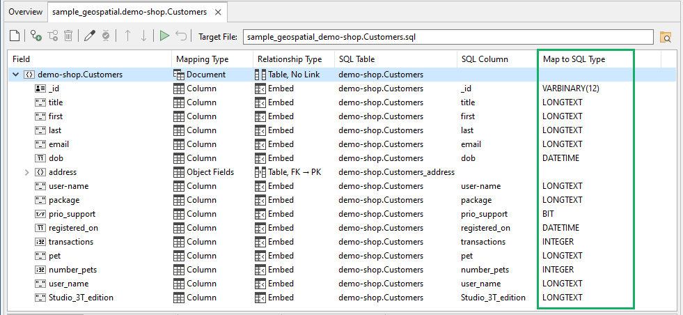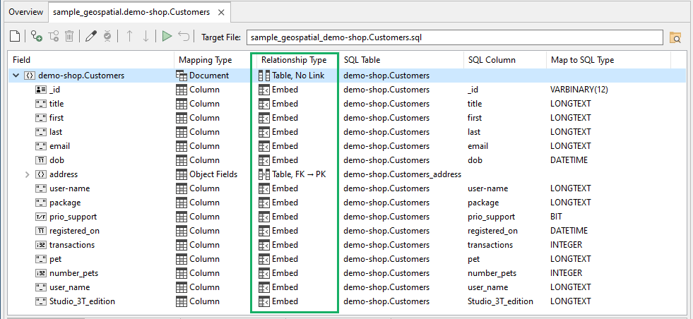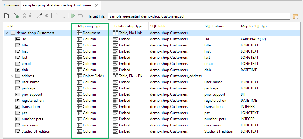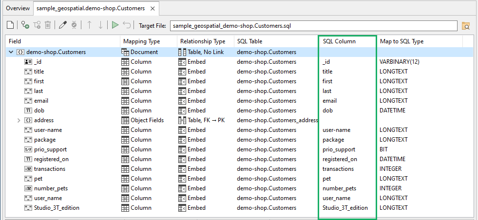 The bulk of MongoDB to SQL mappings are done in the Mapping Type, Relationship Type, SQL Table, SQL Column, and the Map to SQL Type columns: