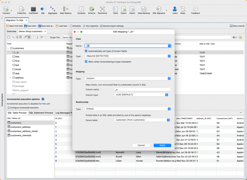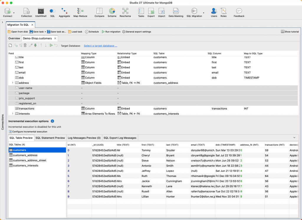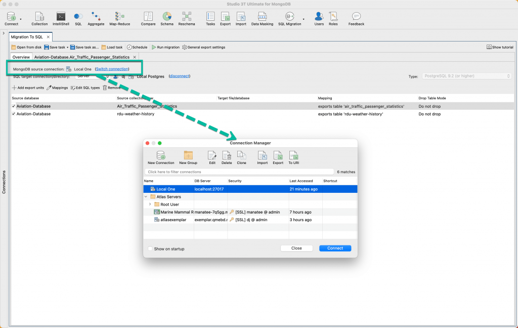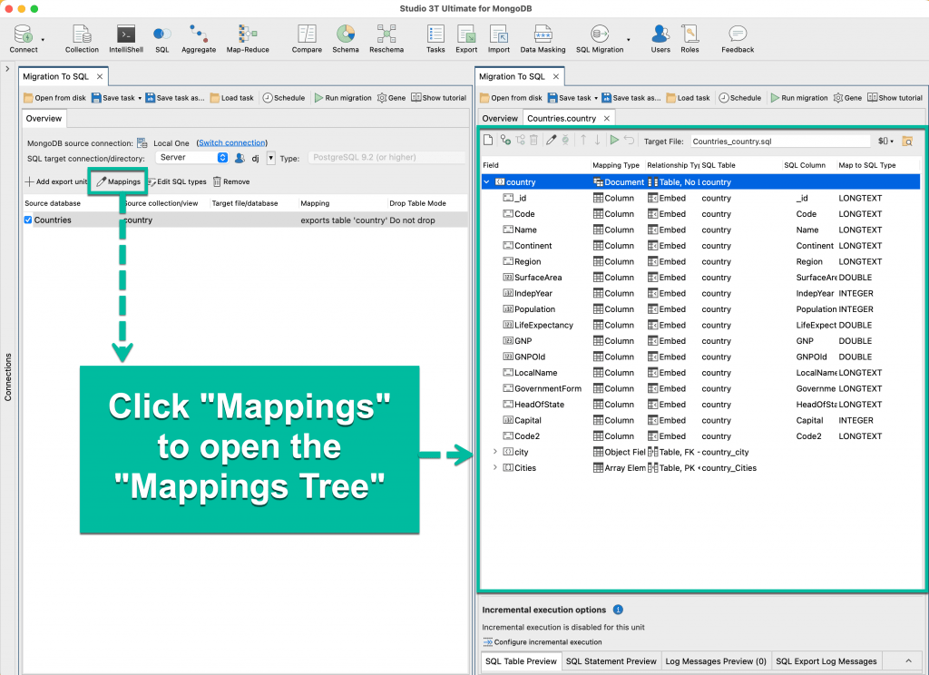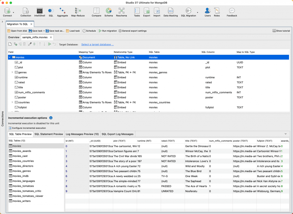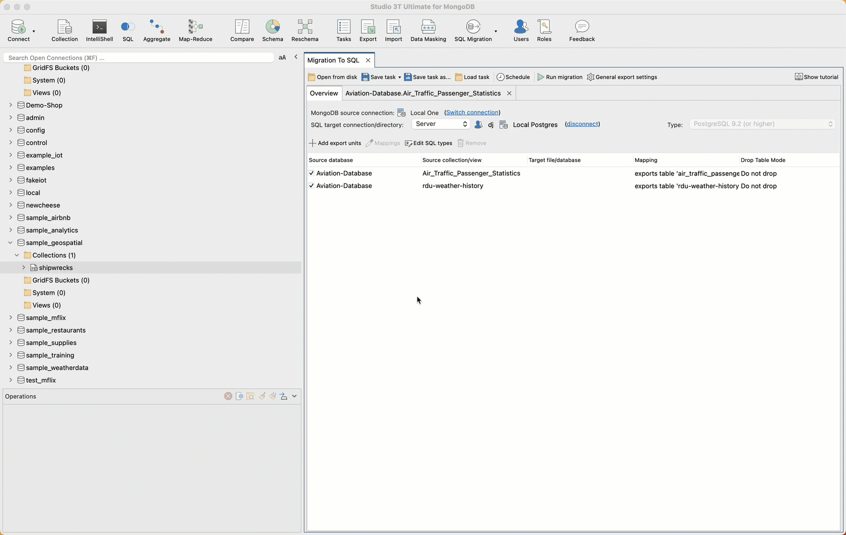 MongoDB to SQL Migration allows you to export MongoDB collections to a SQL file or database. You can automate MongoDB to SQL Migration using Studio 3T’s Tasks feature.