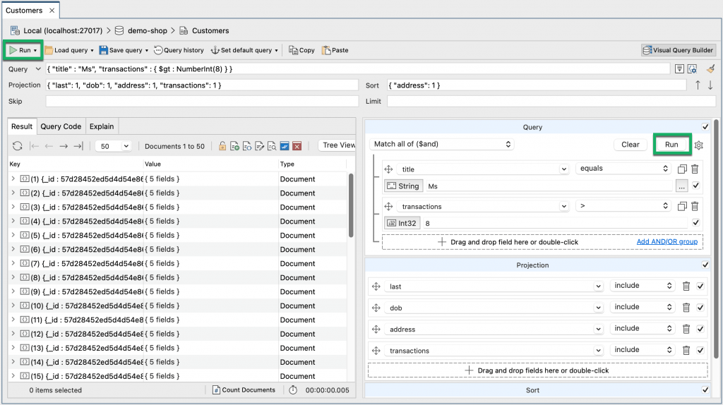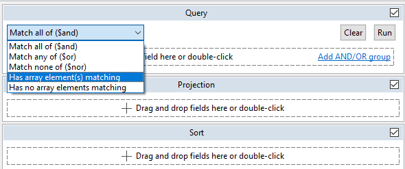 To filter the documents in the collection, define the required operators and values in the Query section and choose the fields you want to include in the Projection section.