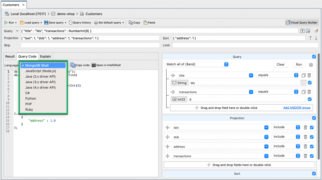 In addition to showing the query in MongoDB Shell language, Query Code can also translate your query into JavaScript, Java, C#, Python, PHP, and Ruby, so you can use it in the applications you’re developing.