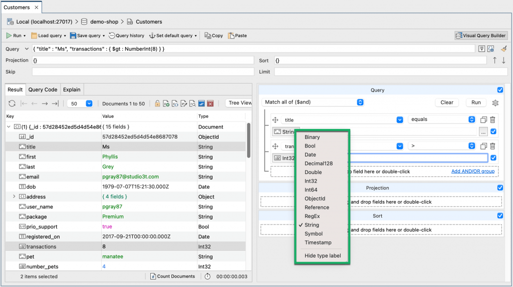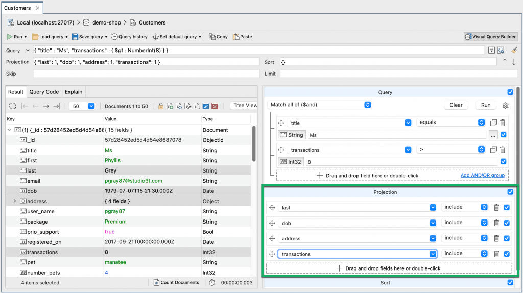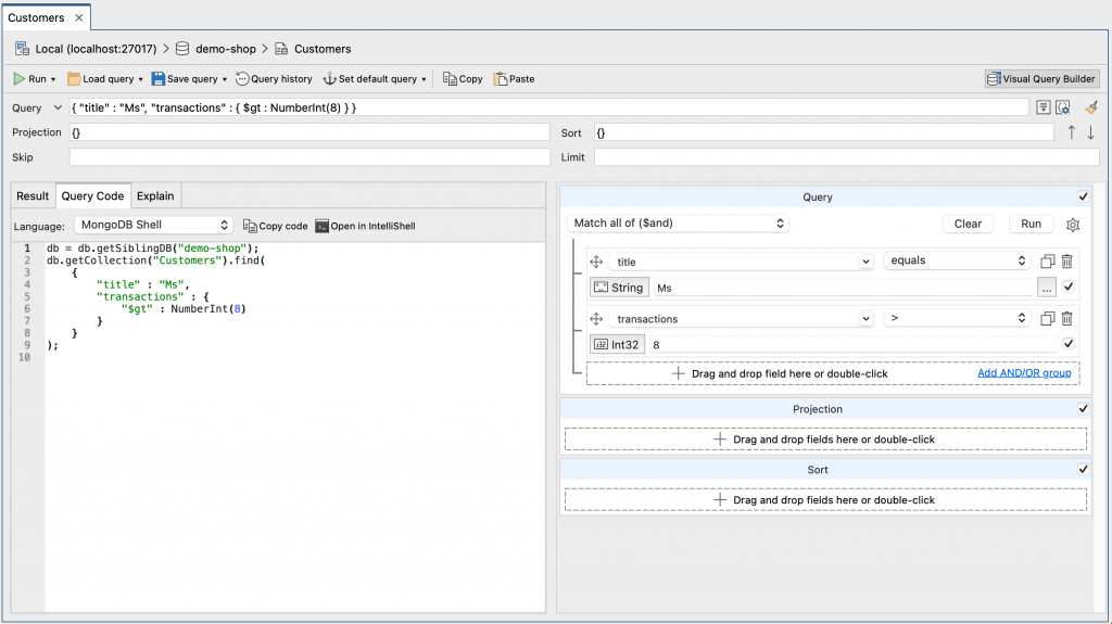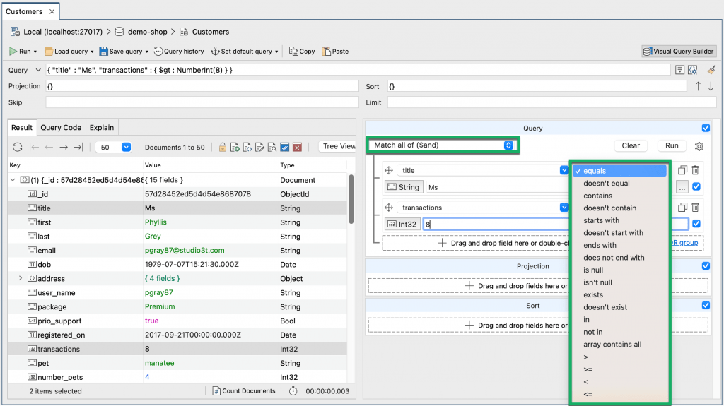 Visual Query Builder is part of the Collection Tab, where you can view, query, and edit documents in a collection. You can drag and drop fields into Visual Query Builder to create a MongoDB query, and as you do this, you’ll see Studio 3T building the MongoDB Shell syntax in the Query Bar.